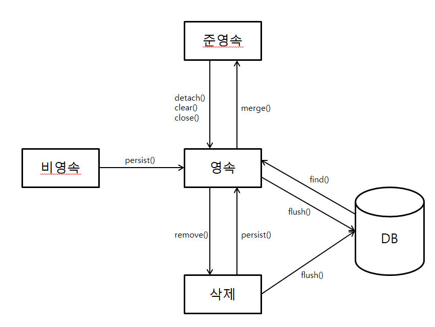 - 비영속 상태 : 영속성 컨텍스트와 전혀 관계가 없는 상태