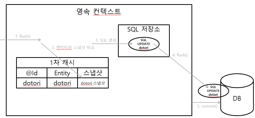 3. 변경된 엔티티가 있다면 수정 쿼리를 생성하여 SQL 저장소에 저장한다.