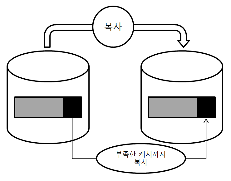 그렇다고 단순히 대수를 늘려 복사하게 된다면 [그림 1]과 같이 아무 의미 없게 되버릴 수도 있다. 캐시 용량을 늘리기위해 확장했으나, 부족한 캐시까지 동일하게 늘려버리게 된 것이다. 따라서, 부족한 캐시에 액세스한 순간에 느려지는 것은 똑같다는 이야기다.
