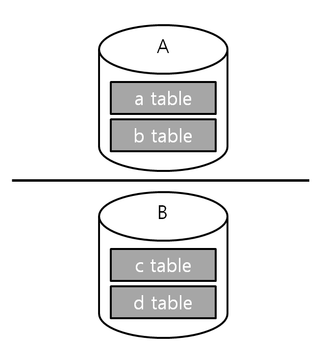 서로 액세스가 많은 a와 b 테이블은 A서버에 두고, c와 d 테이블은 B서버에 둔다. 그렇다면 a, b테이블 접근은 A서버로, c, d테이블 접근은 B서버로 application 설정이 필요할 수도 있다. (실제로 이전 직장에서 사용했었는데 처음 마주하게 되었을때 테이블에 따른 DB 서버 접근 설정을 할 줄 몰라 당황했었다...ㅋㅋㅋ)