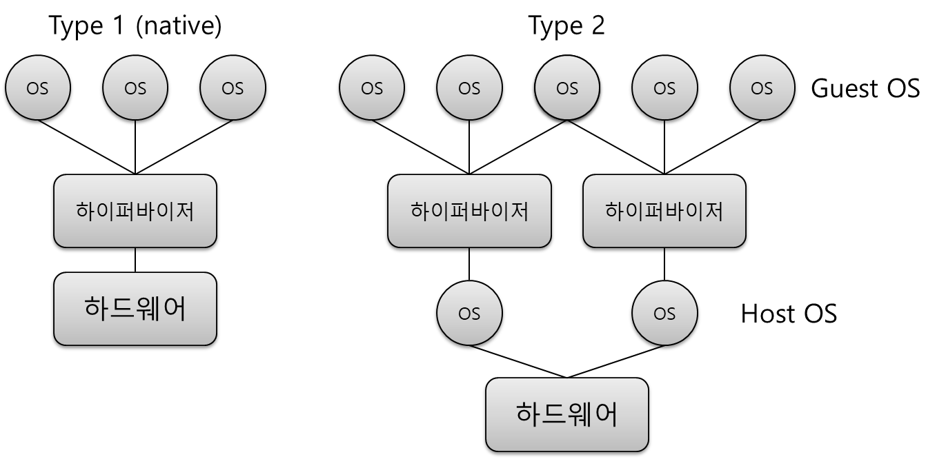 하이퍼바이저를 사용 구조는 두 가지 종류가 있다. [그림 4]를 참고하자면 Type1의 경우 KVM, Hyper-V 등이 있고 Type2는 VMware, VirtualBox 등이 있다.