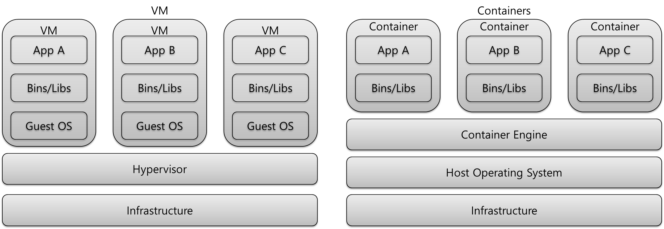 VM의 경우에는 하이퍼바이저 위에 VM이 가상화되어서 동작을하고, 머신단위로 할당이 되기 때문에 OS를 설치를 해주어야한다. 반면에 컨테이너 기술은 호스트 운영체제(Host Operating System)가 있고 그 위에 컨테이너를 구동하기 위한 컨테이너 엔진이 있다. 이 컨테이너 엔진 위에서 컨테이너라는 단위로 앱을 배포할 수 있다. 따라서 각각의 컨테이너마다 OS를 설치할 필요가 없다.