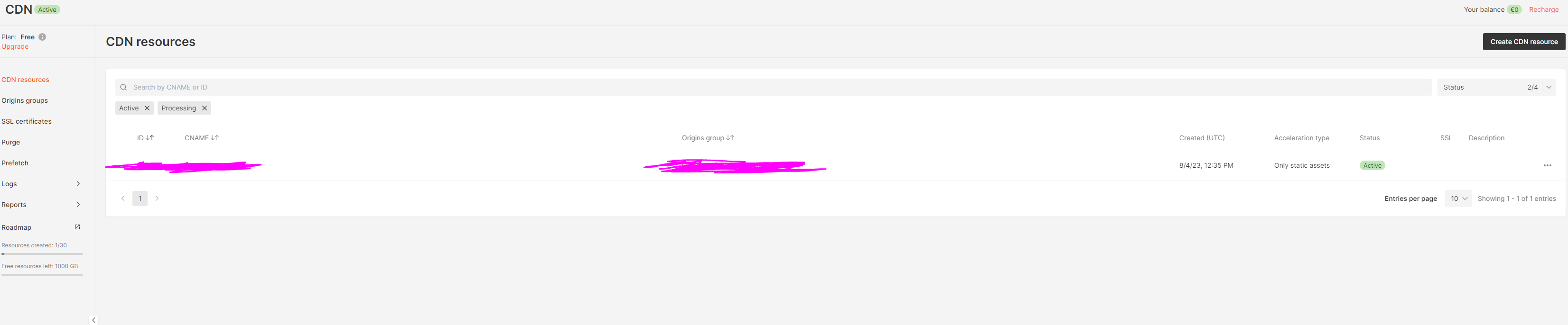 - 새롭게 열린 탭에서 오른쪽 상단에 "create CDN resource"를 클릭하자.