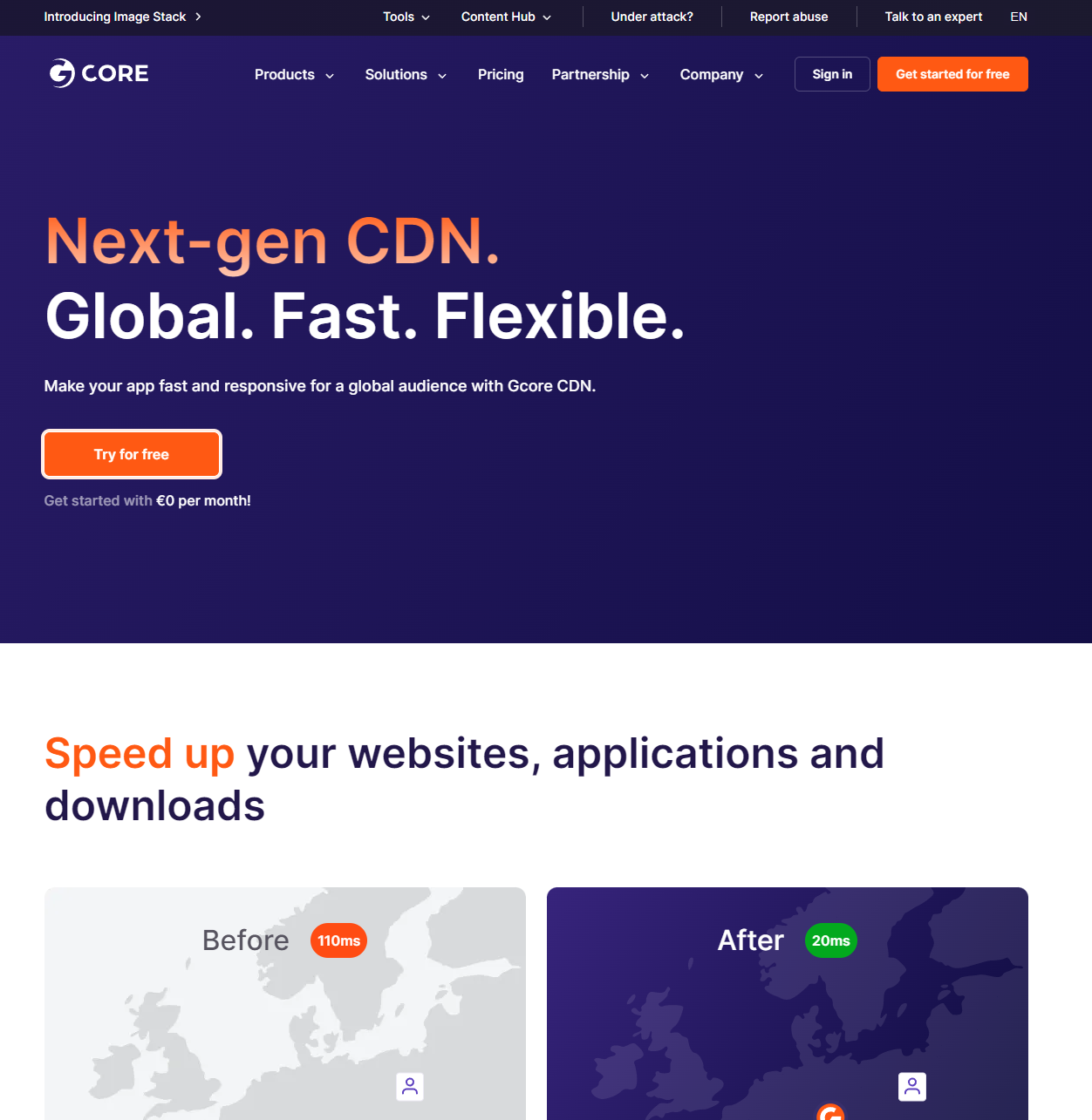 - 도메인을 얻었다면 gcore에 접속하여 "Try for free"를 클릭하자