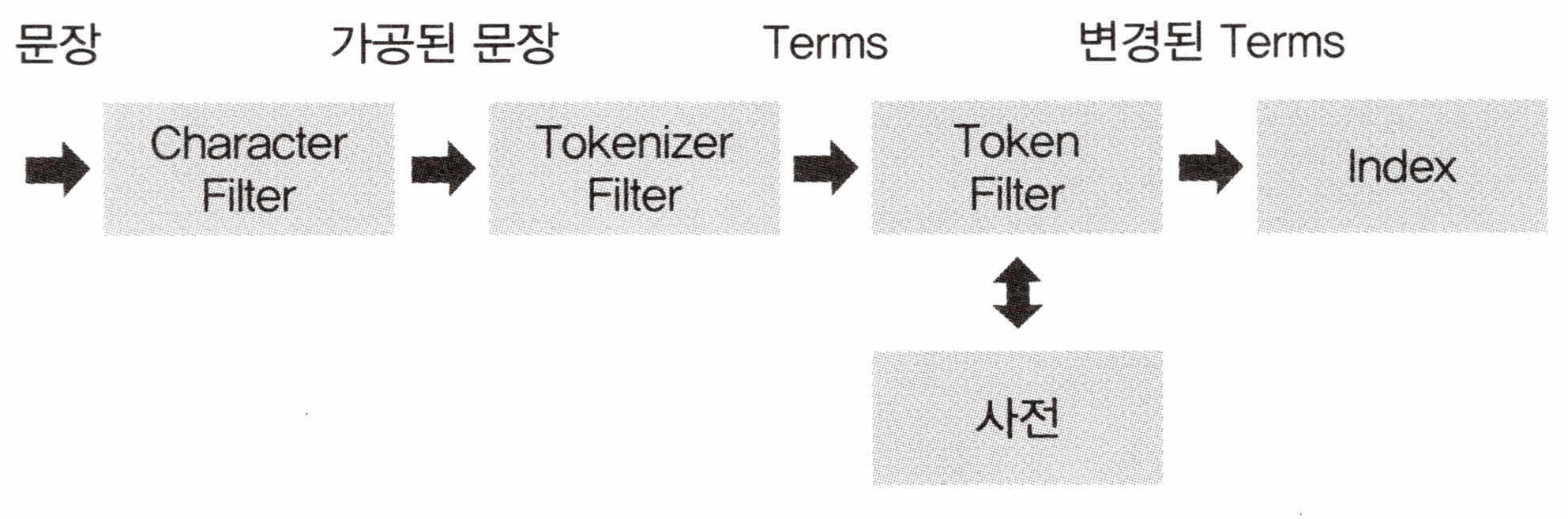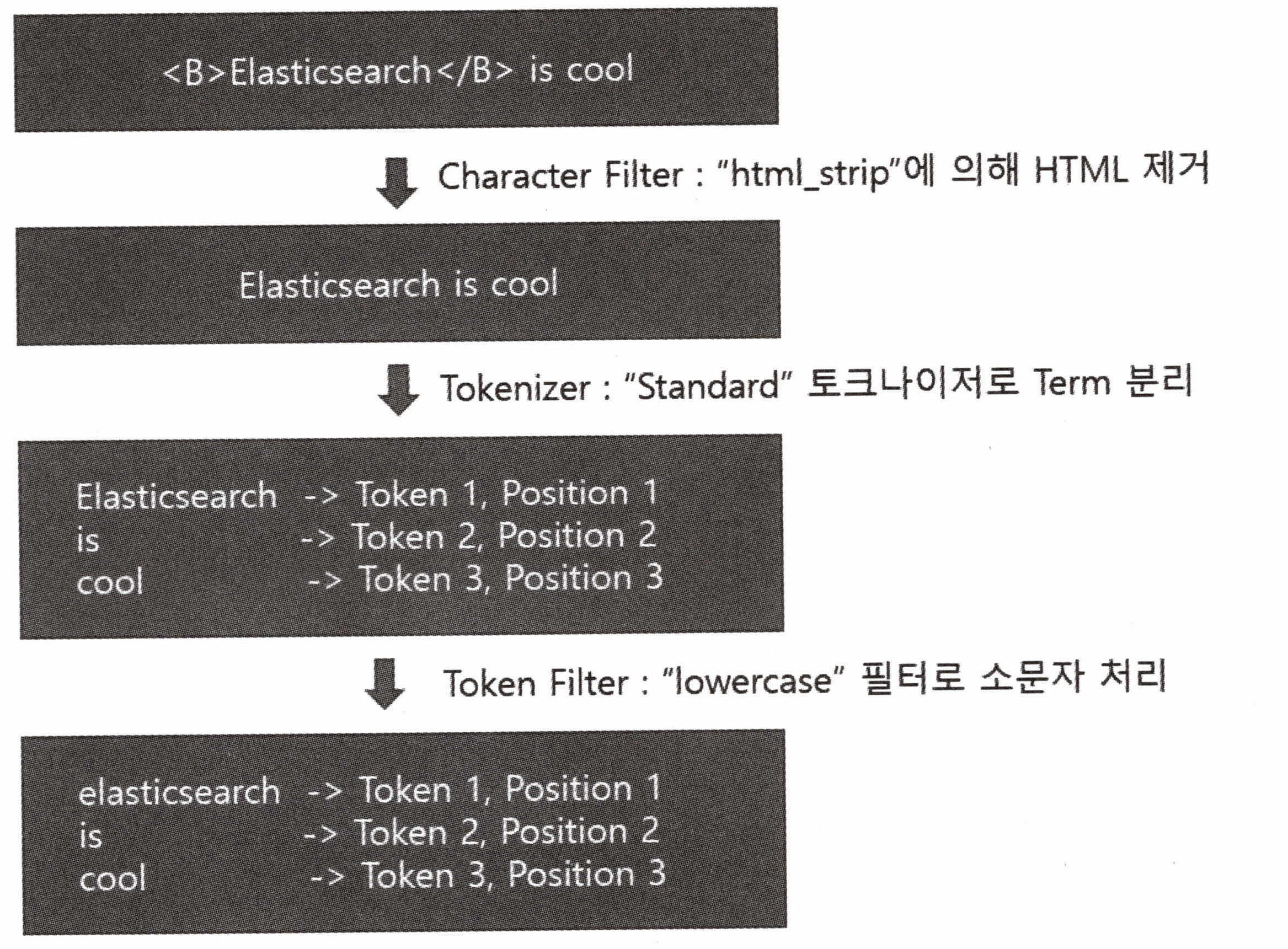 엘라스틱서치는 문서를 색인하기 전에 해당 문서의 필드 타입이 무엇인지 확인하고 텍스트 타입이면 분석기를 통해 이를 분석한다. 텍스트가 분석되면 개별 텀으로 나뉘어 형태소 형태로 분석이 수행된다. 해당 형태소는 특정 원칙에 의해 필터링되어 단어가 삭제되거나 추가/수정되고 최종적으로 역색인된다. 이러한 텍스트 분석은 언어별로 조금씩 다르게 동작하기 때문에 언어별로 분석기를 제공한다. 만약 원하는 분석기가 없다면 직접 개발하거나 Custom Analyzer를 설치해서 사용할 수도 있다. 아래와 같이 토큰은 4부분으로 나뉘는 것을 볼 수 있다.