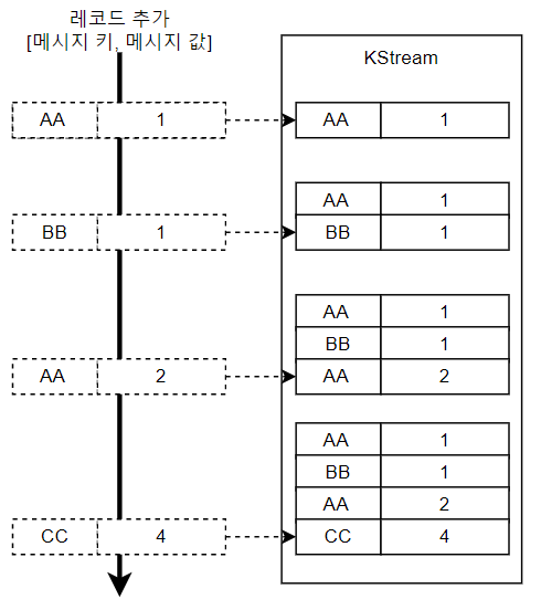 KStreams는 카프카 스트림즈에서 가장 기본이 되는 스트림(Stream)이다. KStream은 레코드(키-값 쌍)의 연속적인 흐름을 나타내며, 실시간으로 데이터를 처리하는 데 사용된다. KStream은 주로 필터링, 매핑, 집계 등의 연산을 수행할 수 있으며, 데이터가 계속해서 들어오는 상황에서 적합한 처리를 할 수 있다. 예를 들어, 특정 토픽에서 데이터를 읽어와서 필터링하고, 다른 토픽에 저장하는 간단한 스트림 처리를 생각할 수 있다.