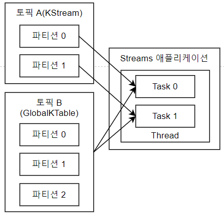 GlobalKTable과 KStream을 조인하는 것은 KTable과의 조인과 유사하지만, GlobalKTable은 클러스터 내 모든 인스턴스에 동일한 데이터를 유지하므로, 모든 인스턴스에서 동일한 데이터를 참조할 수 있다.