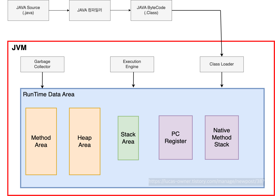 [그림 1]과 같이 jvm은 크게 다섯 가지의 메모리 구조를 갖는다. 컴파일이 된 class 파일은 Class Loader로부터 method 영역에 로드된다.