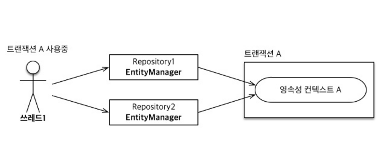 [그림 2]와 같이 트랜잭션이 같으면 같은 영속성 컨텍스트를 사용한다. 따라서 엔티티 매니저는 달라도 같은 영속성 컨텍스트를 사용한다.