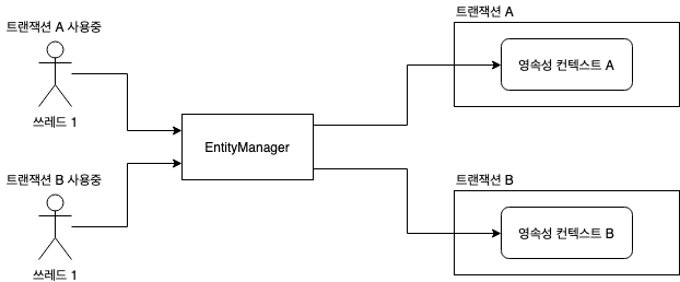 반면에 [그림 3]을 보면 트랜잭션이 다르면 다른 영속성 컨텍스트를 사용하는 것을 볼 수 있다. 따라서 같은 엔티티 매니저를 호출해도 접근하는 영속성 컨텍스트가 다르므로 멀티스레드 상황에 안전하다.