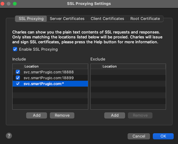 각 디바이스에 인증서를 등록했다면 이제 SSL Proxy 설정을 해주어야한다. [그림 5]와 같이 [Proxy] -> [SSL Proxying Settings]에서 푸르지오 스마트홈 서버를 include해준다. port를 모르겠다면 아스트리스크(*)를 사용해도 된다.