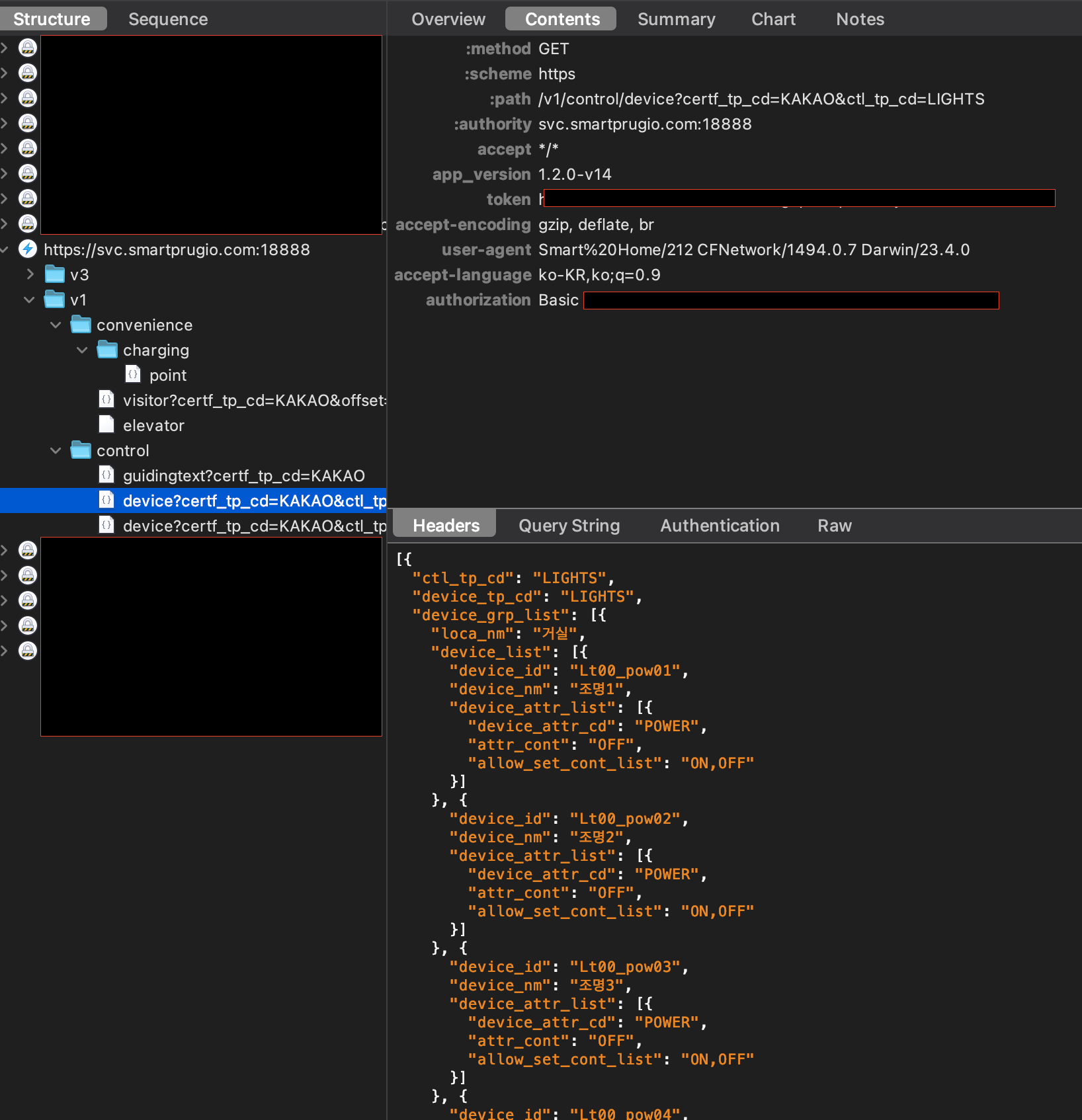 모든 설정은 마쳤다. 이제 charles를 재시작해주고 푸르지오 스마트홈을 실행하여 원하는 액션을 취하면 된다. [그림 6]와 같이 전기차 충전소 상태, 방문자 조회, 조명, 엘리베이터 호출에 대한 api 정보를 볼 수 있다. contents를 보면 인증토큰과 basic 토큰이 그대로 노출되는 것을 볼 수 있다.