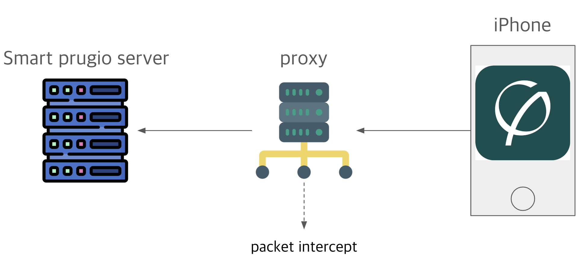 [그림 1]과 같이 푸르지오 앱에서 특정 액션을 취했을 때 어떤 통신을 하는지, 어떤 데이터가 오고 가는지 알기 위해서 proxy를 통해 패킷을 감청하고 분석한다. proxy는 trio_http_proxy를 입맛대로 수정하여 최종적으로 .pcap 파일로 export하는 로직을 추가했다. 나는 개인 서버 PC에서 proxy를 실행했지만 로컬에서 실행해도 된다.