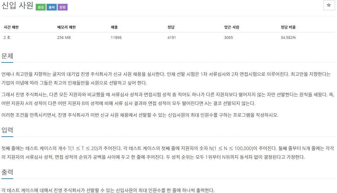 문제를 읽고 "이건 무조건 객체 정렬이다!"라고 생각했다. 가장 먼저 서류 설적과 면접 성적을 따로 받고 두 성적에 대해 제한을 두고 있으니 당연한 것이 아닌가.