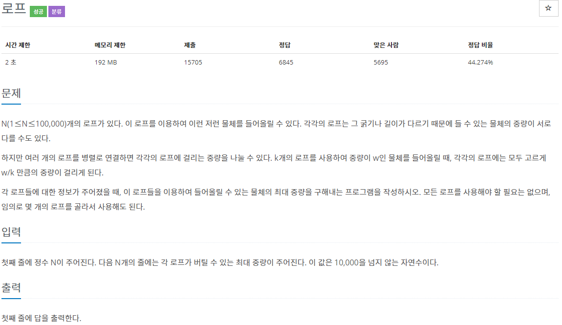 1. N개의 버틸 수 있는 중량을 배열에 저장하여 sort. 2. 버틸 수 있는 최대 중량을 구해야하므로 큰 값 먼저 탐색하여 다음 식을 적용 i번째 로프의 버틸 수 있는 중량 x (로프의 수 - i) 3. 최대값이 정답이 된다. |