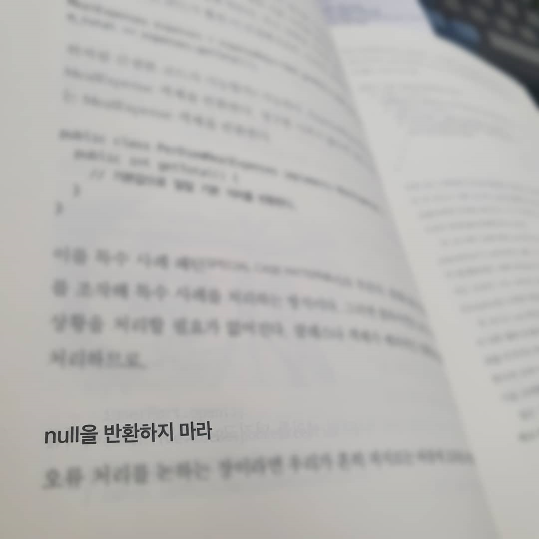 null을 return하지 않고 좋은 방법이 있었다. null을 리턴 해놓고 그것에 대해 예외처리를 한 들, 나중에 어떤 화살로 돌아올지는 아무도 모른다. null을 왜 반환하면 안되는지 궁금하다면 꼭 책을 읽어보자!!! (뼈저리게 느낄 수 있음 주의ㅋㅋ)