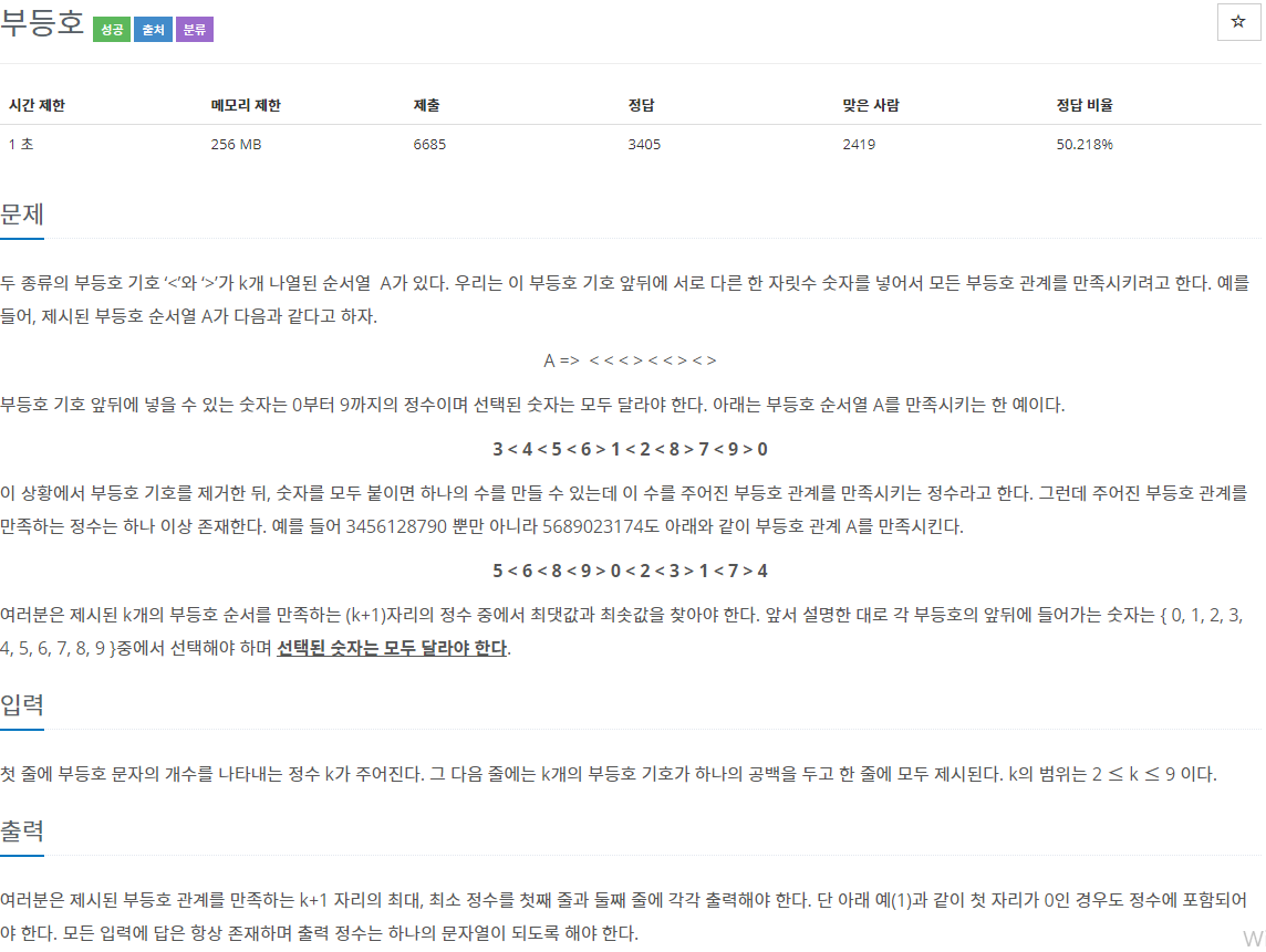 문제 기출 : [https://www.acmicpc.net/problem/2529]