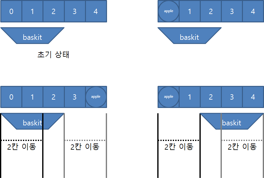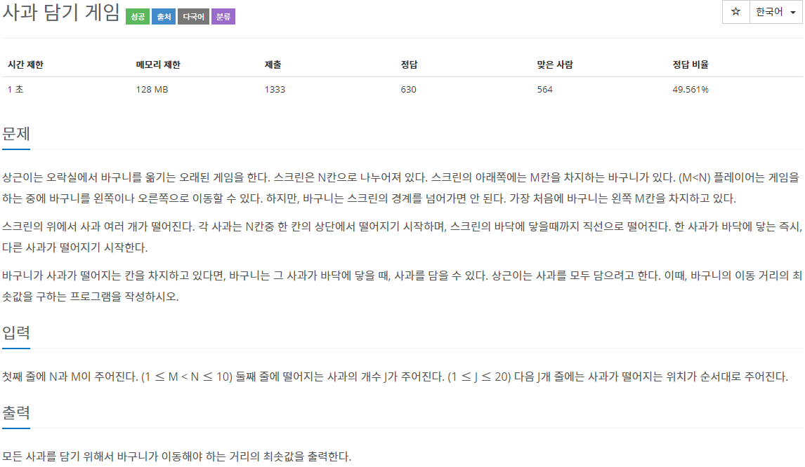 이 문제에서 중요한건 M은 N보다 항상 작으므로 신경쓰지 않아도 된다. 다음 식을 적용한다. 1. 사과의 위치가 바구니 위치 범위에 포함되면 움직이지 않는다. 2. 사과의 위치가 바구니 끝 위치보다 크면 바구니 첫 위치와 끝 위치에(사과 index - 바구니 끝 index)를 더해준다. 3. 사과의 위치가 바구니 끝 위치보다 크면 바구니 첫 위치와 끝 위치에(사과 index - 바구니 첫 index)를 더해준다. 4. 사과의 위치가 바구니 위치 범위에 포함되지 않으면 더해준 값을 누적한다.