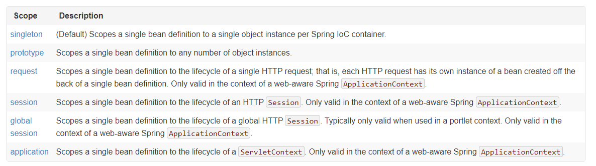 scope의 default가 singleton임을 참고하여 다른 scope를 알아보자.