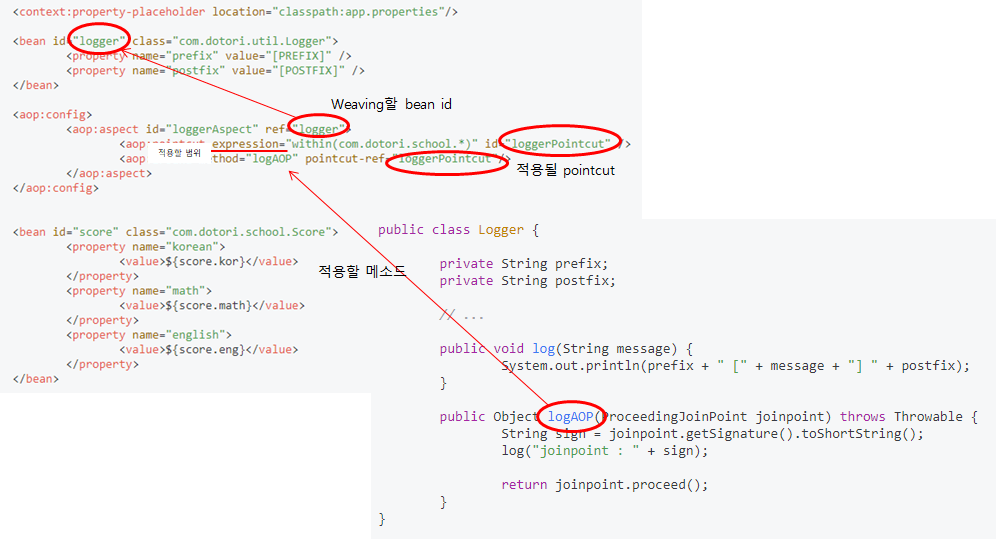 2. aspect는 적용될 AOP가 있는 class의 bean을 참조한다 (나는 logger를 참조 시켰다.)