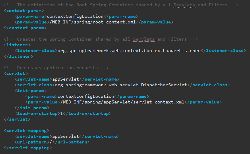 Dispatcher 서블릿 맵핑과 spring 설정 파일의 위치를 설정하고 있다.