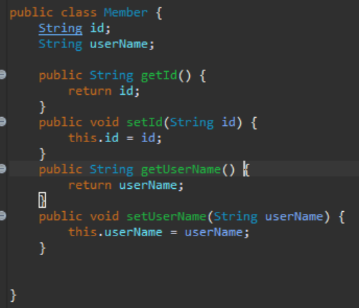 member라는 객체에서 id 혹은 userName를 가지고오는 것. 주의할 점은 Member 클래스는 다음과 같이 GET parameter와 이름이 동일해야한다는 점이고 각각 getter와 setter를 만들어 주어야한다는 것이다.