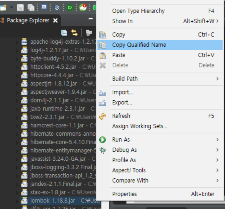 step.1 먼저 상기 내용과 같이 build.gradle에 lombok을 dependency 걸어 준다. 그럼 gradle caches 디렉토리 안에 lombok이 생긴다. 만약 경로를 잘 모르겠다면 eclipse에서 Copy Qualified Name을 이용하면 쉽다. 해당 경로를 복사해서 cmd 혹은 bash를 열어서 해당 경로로 들어간다.