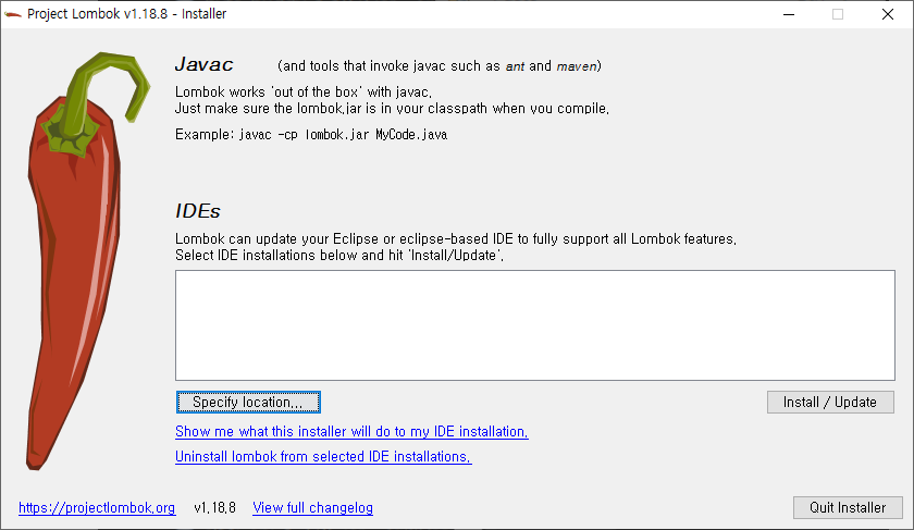 Lombok이 실행되면 상기 내용과 같은 창이 뜰 것이다. Specify location 버튼을 클릭하고 본인의 IDE를 추가하여 install 버튼을 클릭하면 준비가 끝난다.