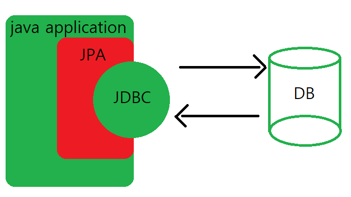 - JPA는 java application과 데이터베이스 사이에 추상화된 데이터 접근 계층을 제공해서 데이터베이스 기술에 종속되지 않는다. 데이터베이스를 변경하게되면 JPA에게 "우리 이 데이터베이스로 바꿨어!"라고 알려주기만 하면 된다. 다음 그림을 참고하자.